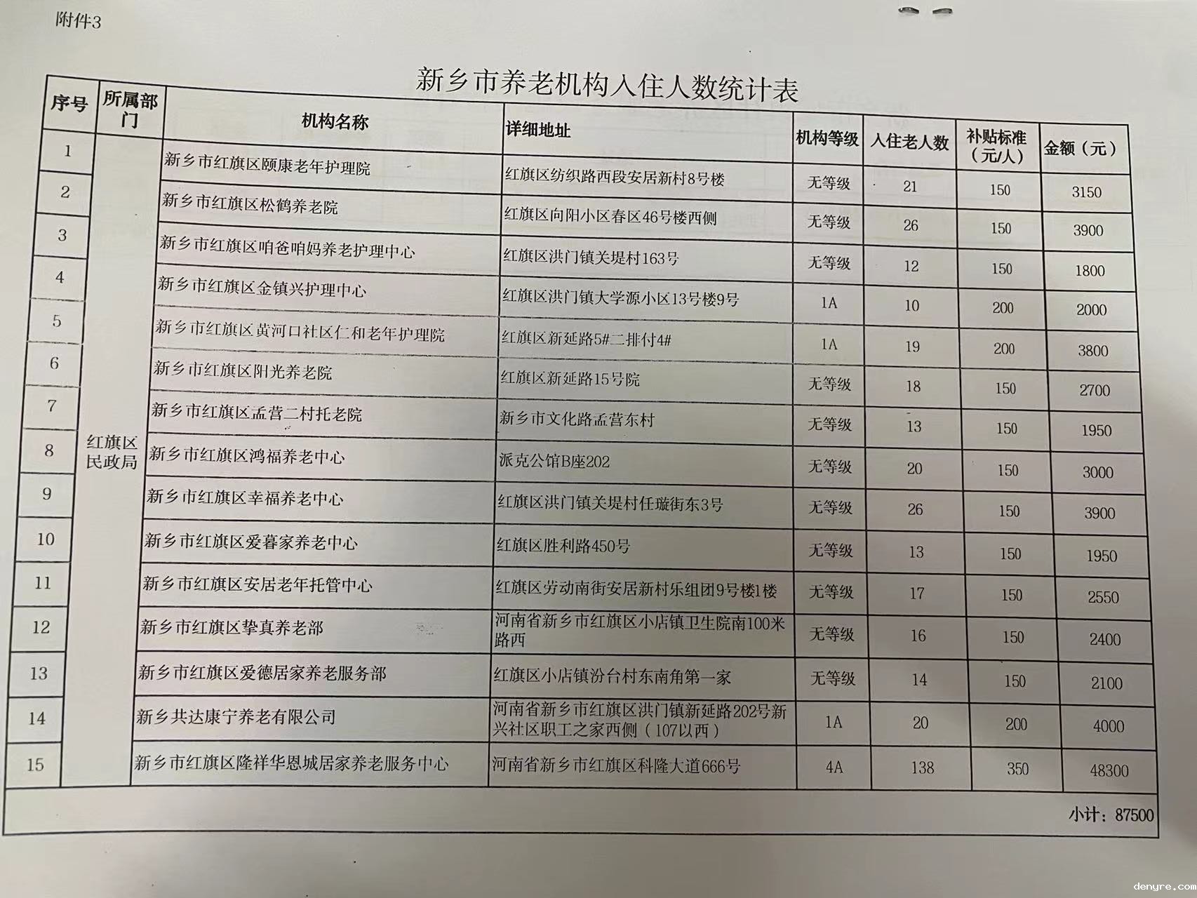 新乡市红旗区养老机构补贴明细表