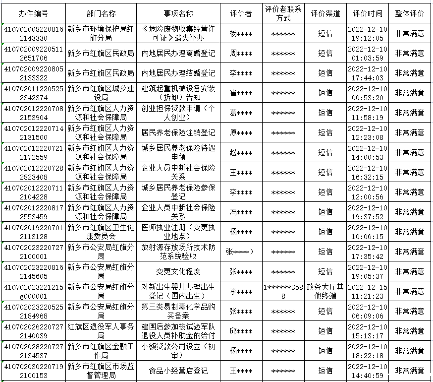 为主动接受社会群众监督,进一步提升政务服务水平,现将全区2022年12月10日-12月16日政务服务“好差评”结果公示如下: