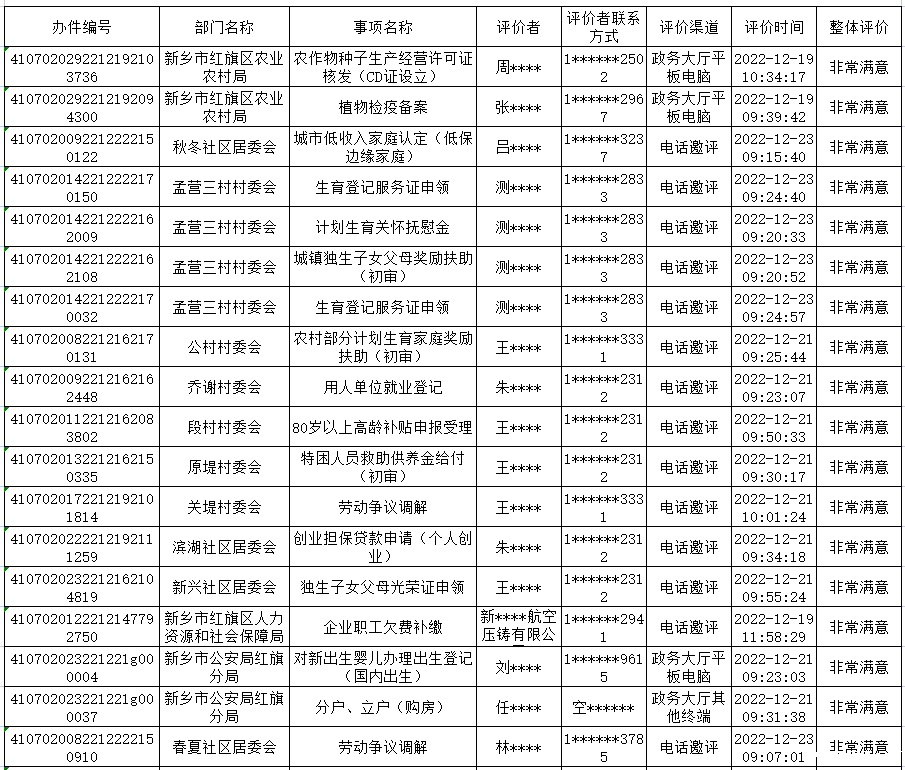 为主动接受社会群众监督,进一步提升政务服务水平,现将全区2022年12月17月-12月23日政务服务“好差评”结果公示如下: