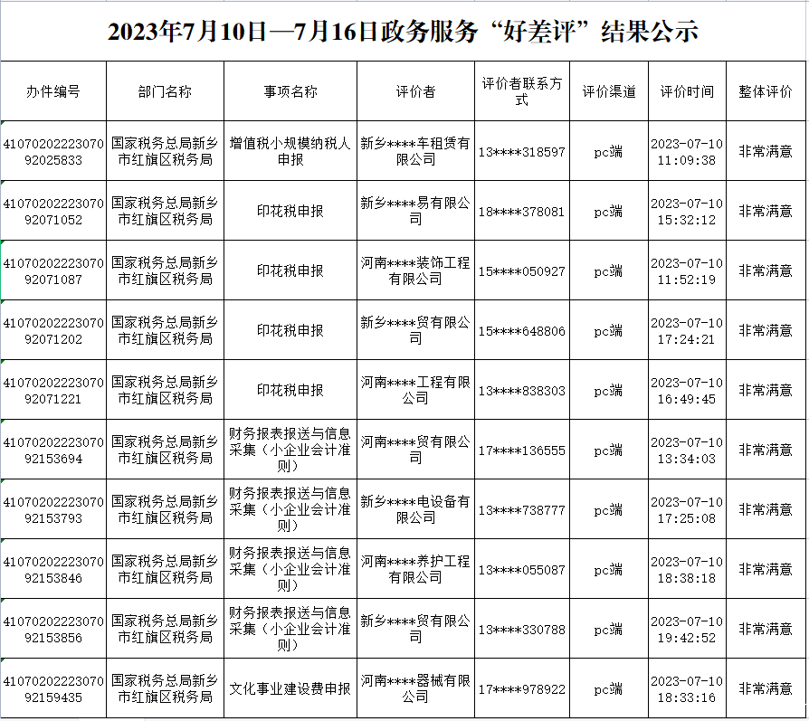 年7月10日-7月16日政务服务“好差评”结果公示如下: