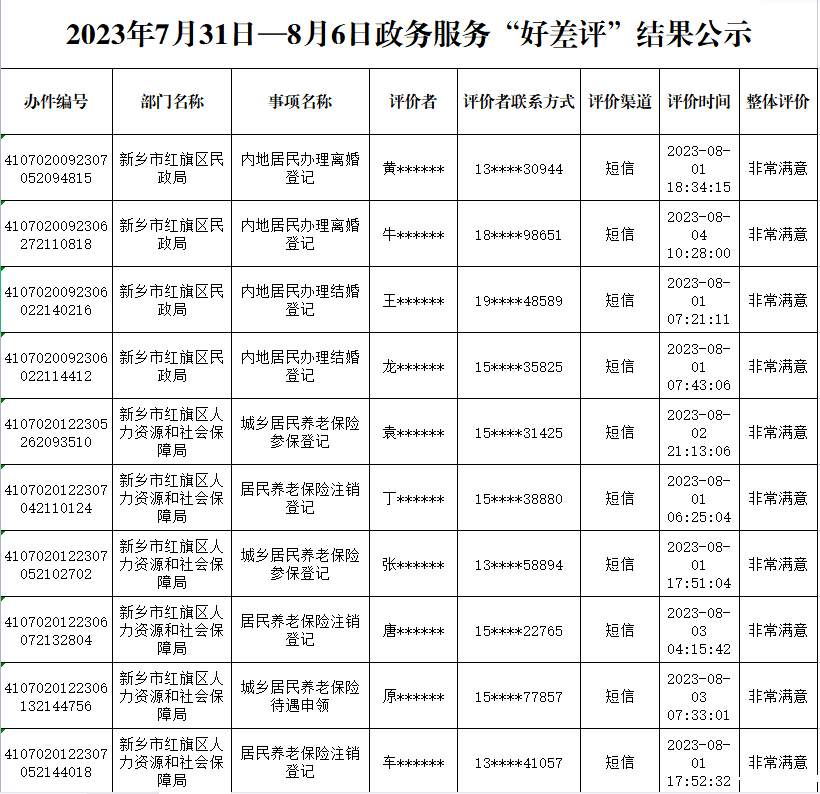 年7月31日-8月6日政务服务“好差评”结果公示如下: