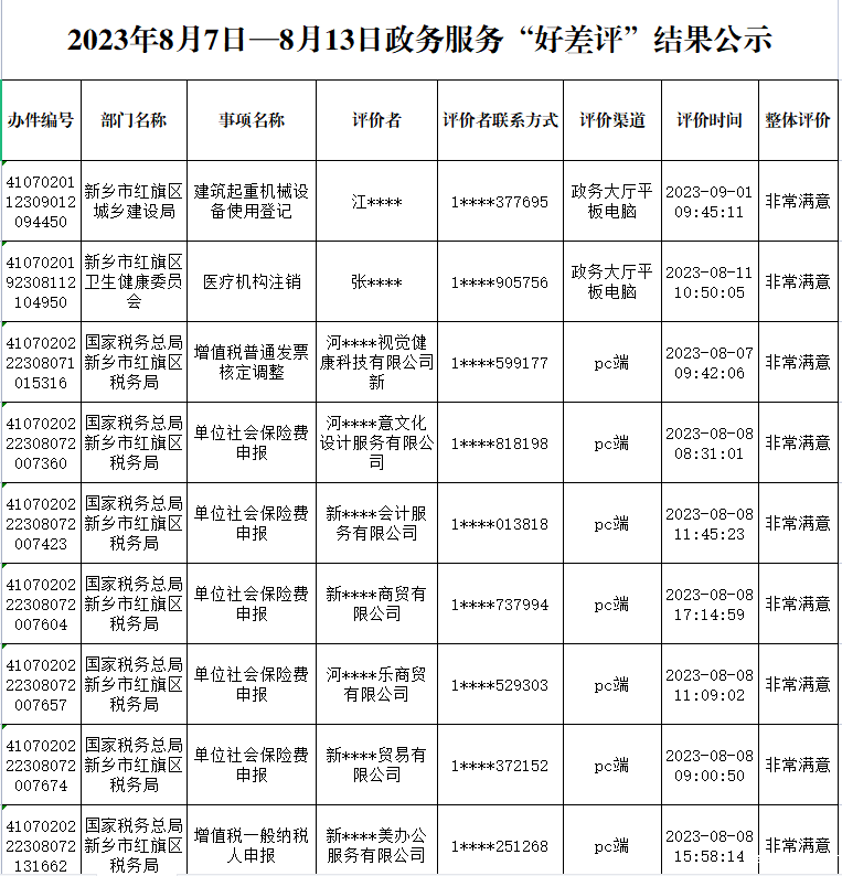 年8月7日-8月13日政务服务“好差评”结果公示如下: